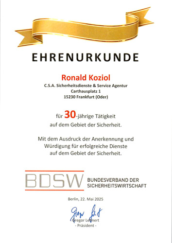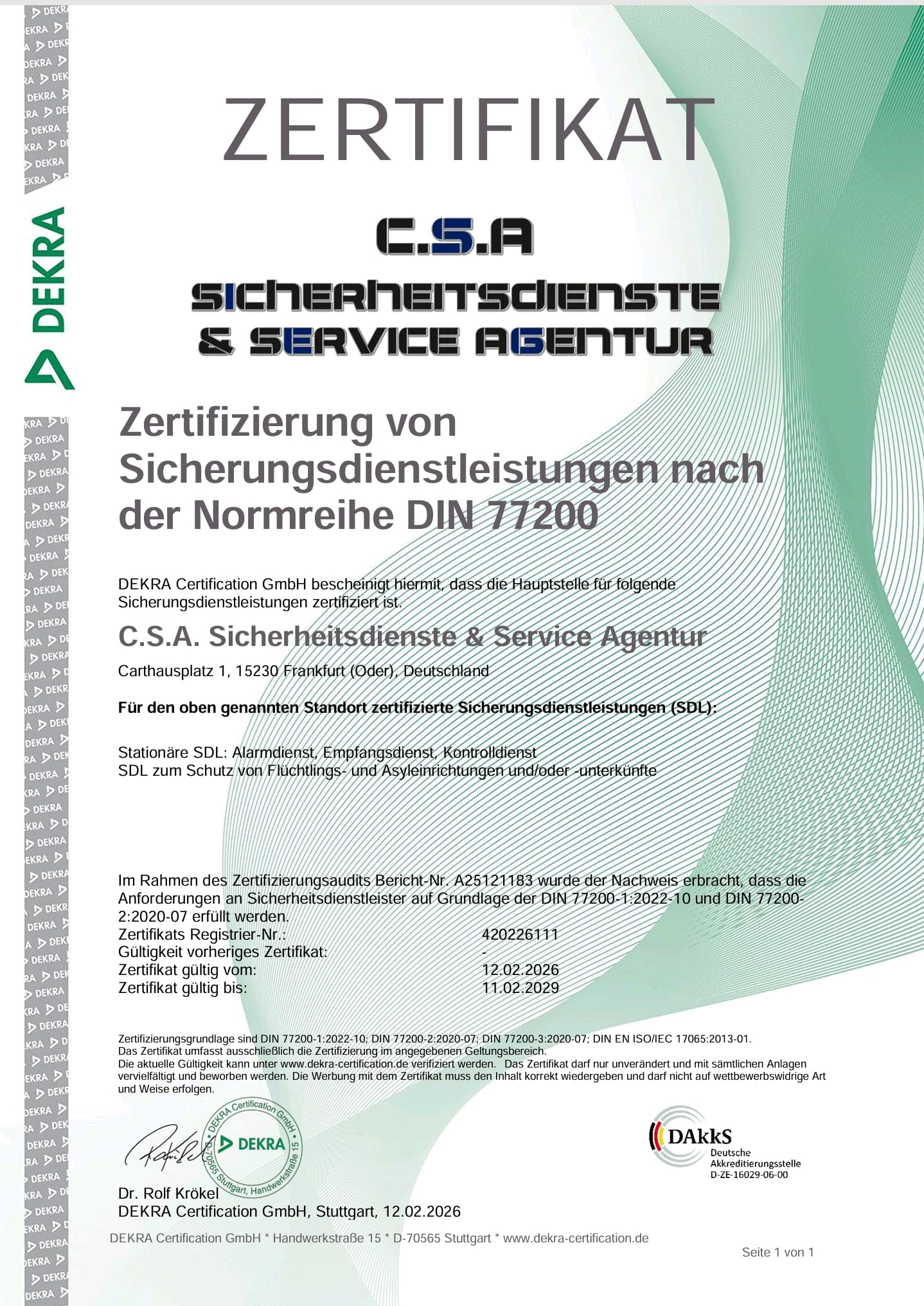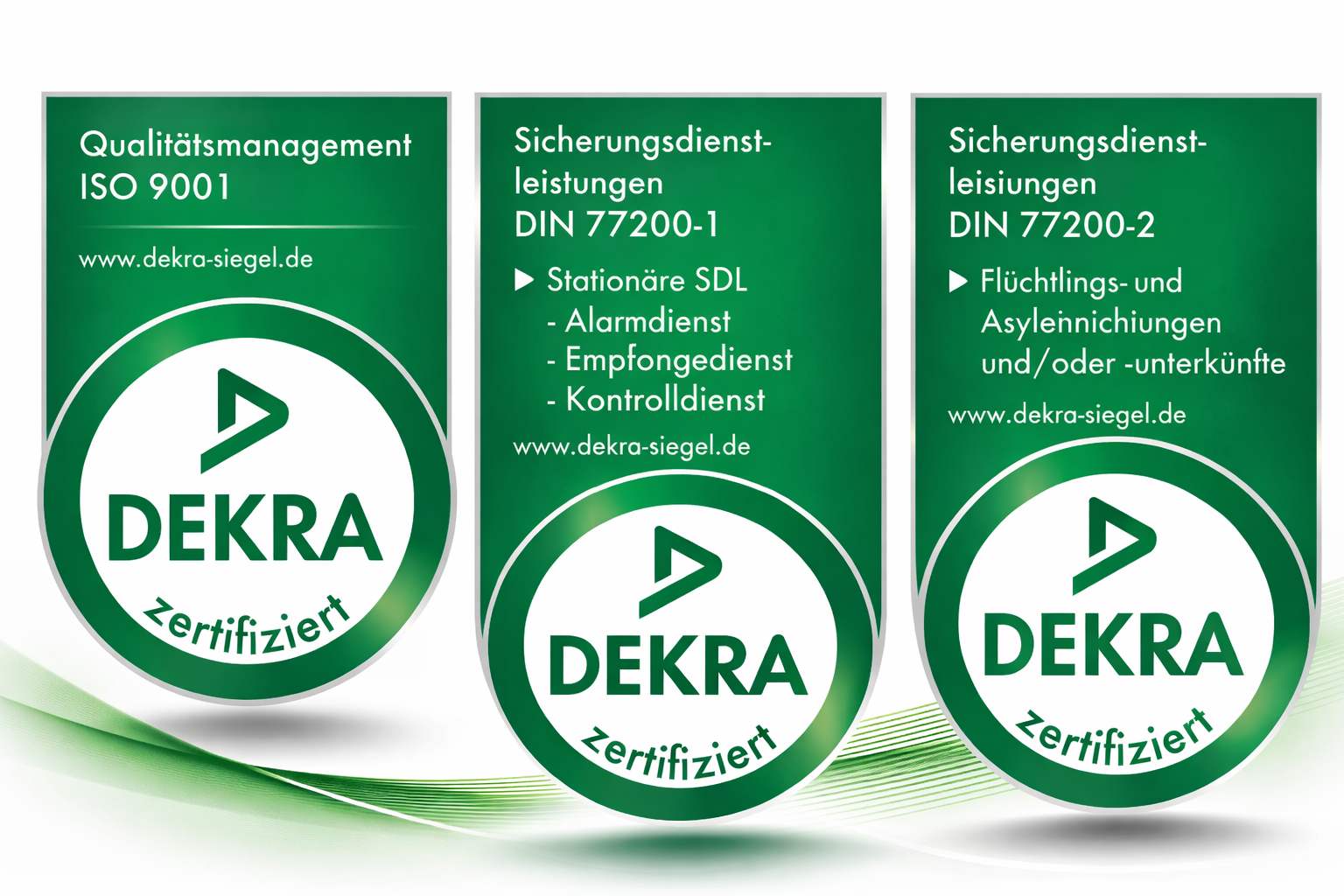 Zudem erfüllen wir die Anforderungen der DIN 77200-1 für stationäre Sicherheitsdienstleistungen (u. a. Alarm-, Empfangs- und Kontrolldienst) sowie der DIN 77200-2 für Sicherheitsdienstleistungen in Flüchtlings- und Asyleinrichtungen.
