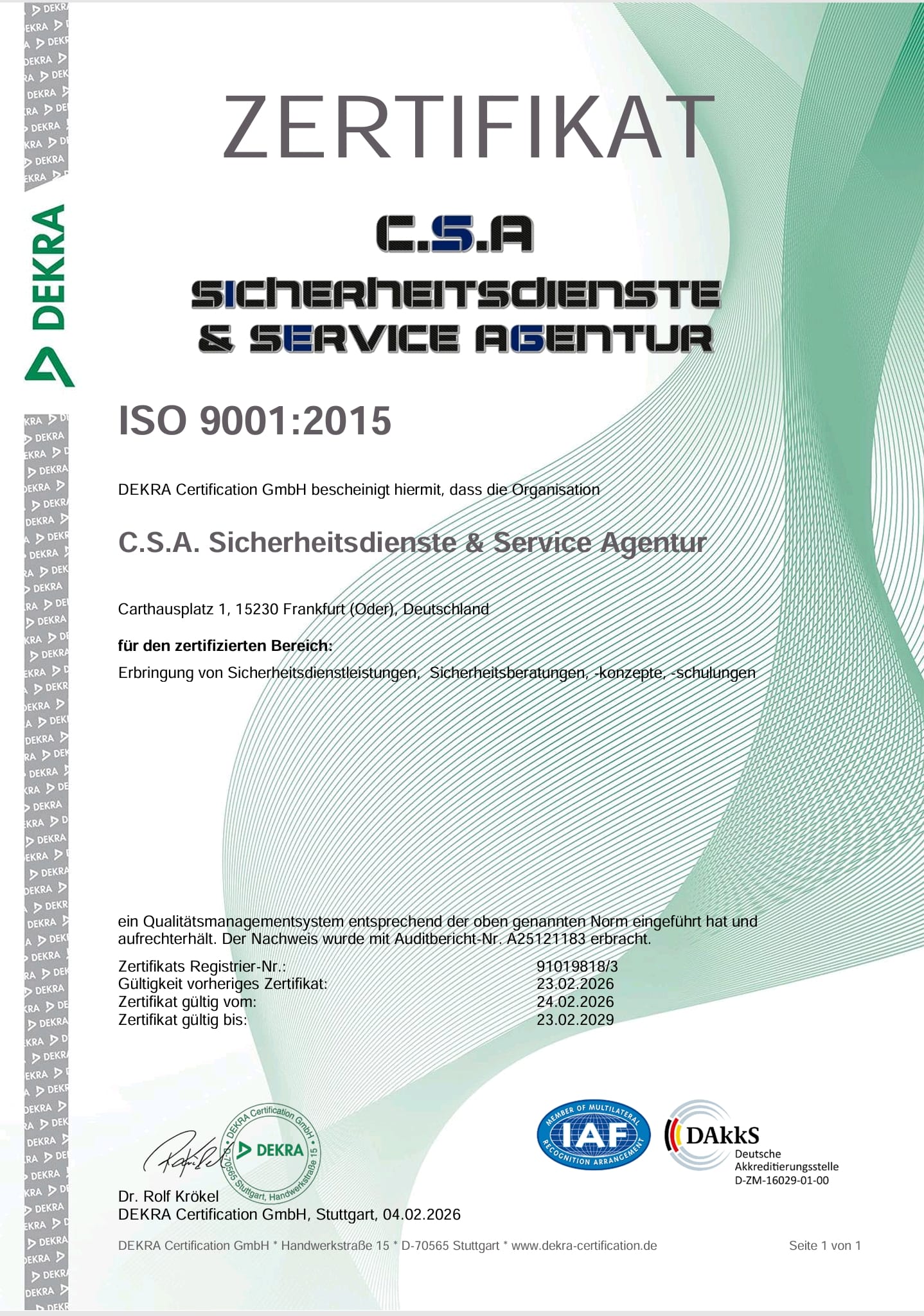 Unser Unternehmen ist durch DEKRA zertifiziert und arbeitet nach einem Qualitätsmanagementsystem gemäß ISO 9001.