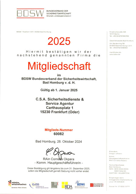 Zudem erfüllen wir die Anforderungen der DIN 77200-1 für stationäre Sicherheitsdienstleistungen (u. a. Alarm-, Empfangs- und Kontrolldienst) sowie der DIN 77200-2 für Sicherheitsdienstleistungen in Flüchtlings- und Asyleinrichtungen.